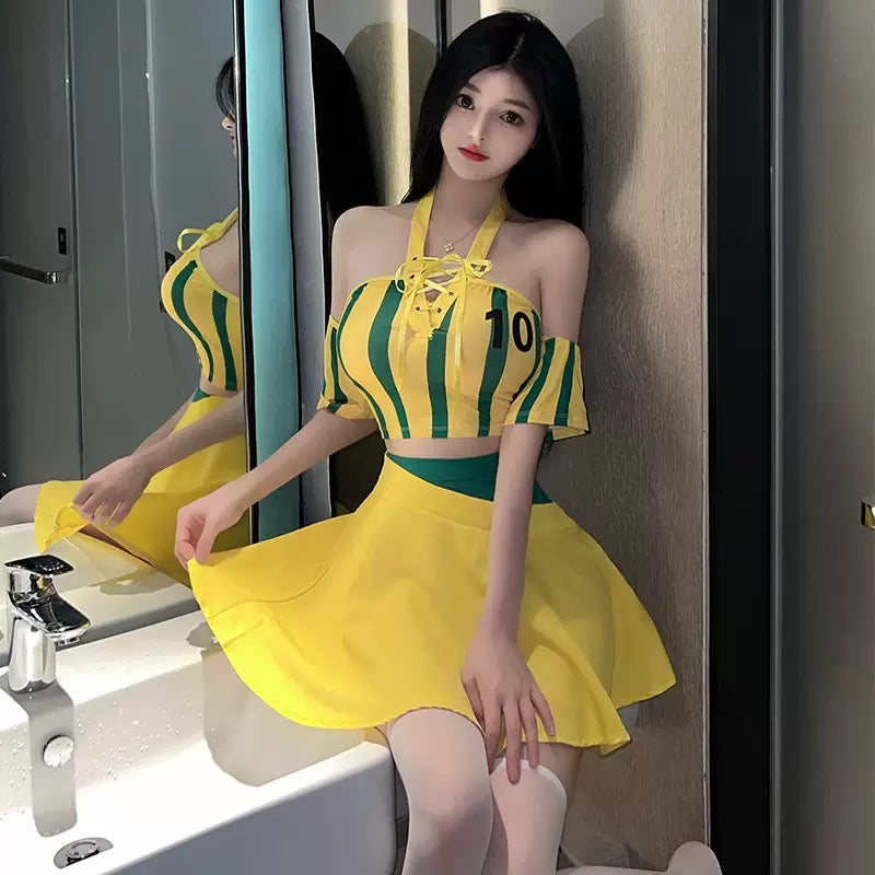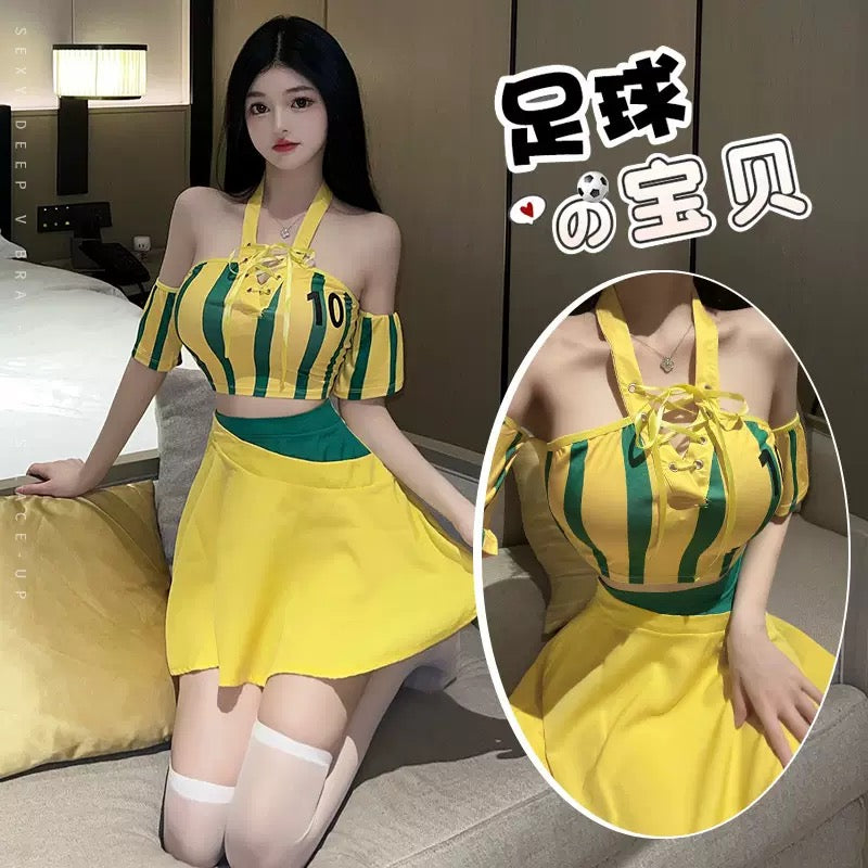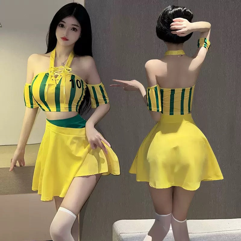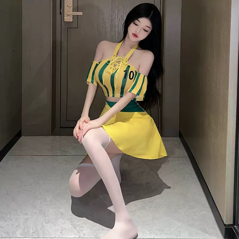 🏆 The Cheerleader Aesthetic No soccer babe look is complete without the skirt. The matching mini pleated skirt bounces with every step, serving major youthful energy. Paired with the included striped knee-high socks, it creates that irresistible "Zettai Ryouiki" (Absolute Territory) gap between the skirt and socks that fans go crazy for.