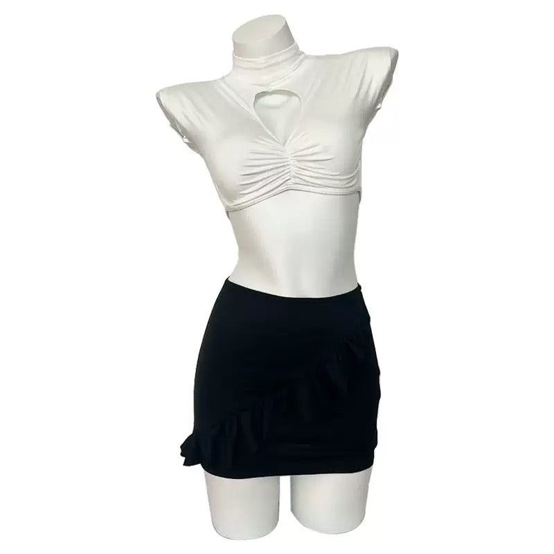 🖤 Flirty Ruffled Bodycon Skirt The bottom is a sleek Black Bodycon Mini Skirt that hugs your hips to create that coveted hourglass silhouette. But we didn't stop at just tight; we added a playful Asymmetrical Ruffle Trim across the front. It adds movement and a touch of girlish charm to the serious silhouette, making your walk mesmerizing.